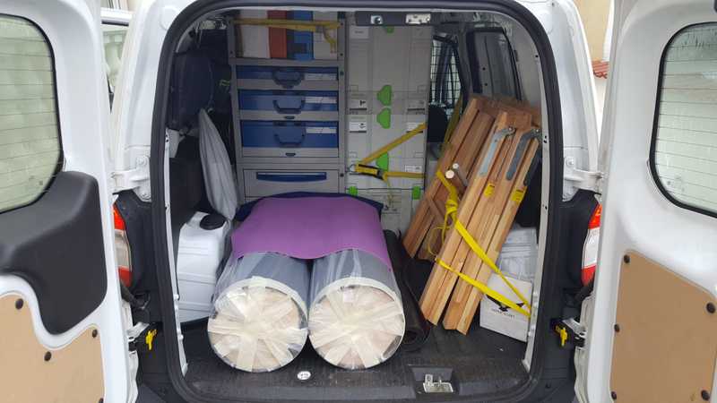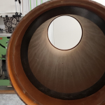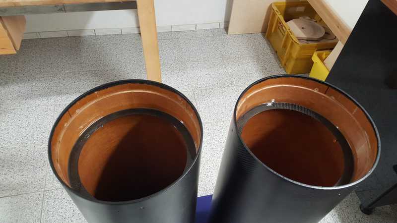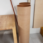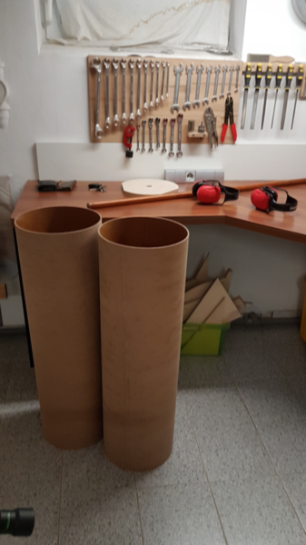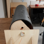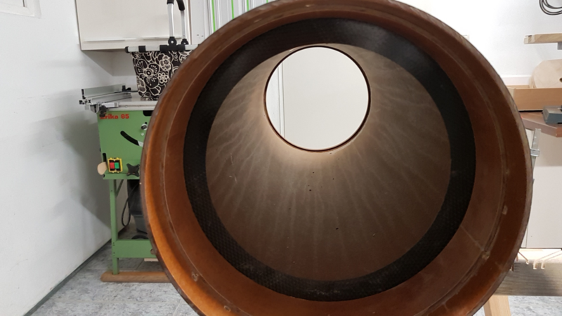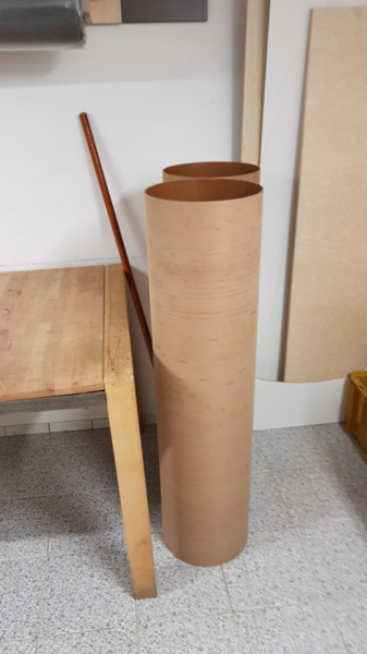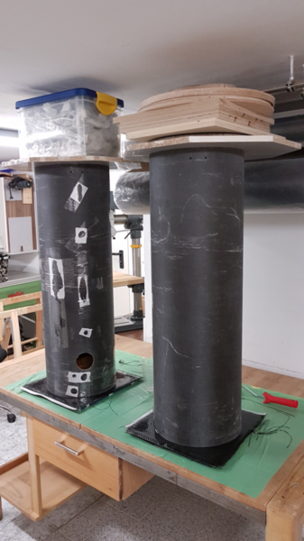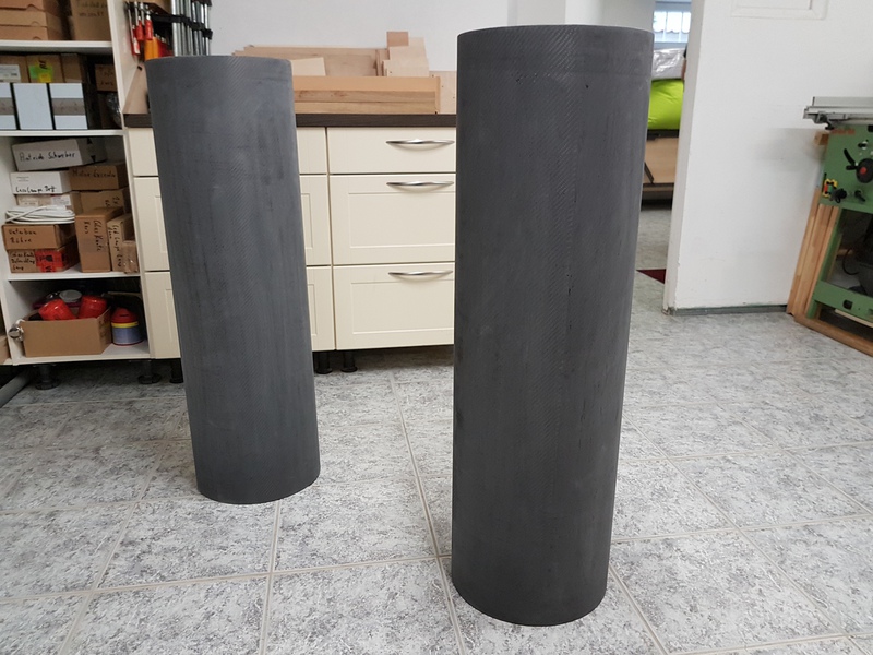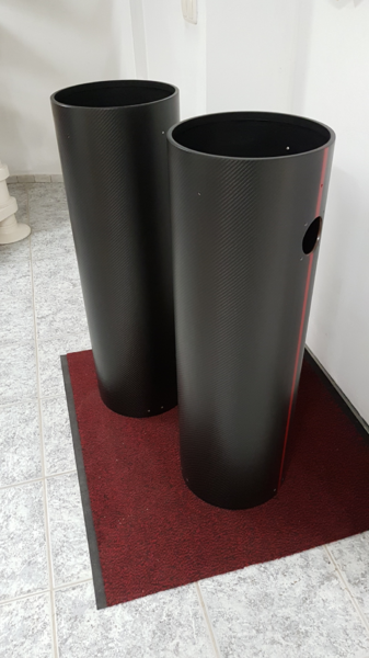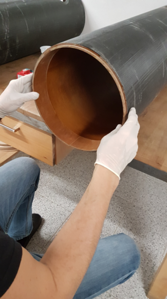 Als Tubusmaterial stellten wir uns ein Sandwich aus Hartpapier und Kohlefaser vor, um die Vorzüge der beiden Materialien zu kombinieren. Hier mussten wir einen Kompromiss eingehen, da wir mit unseren einfachen Mitteln nicht in der Lage waren, große Rundkörper aus reinem Kohlefaser oder auch Sandwiches mit Hartschaumkern und Kohlefasermatten selber herzustellen. Die bereits runde Form der Hartpapier Tuben, die wir bei Gerd Neumann jr. bestellten, hatten als Grundform große Vorteile.