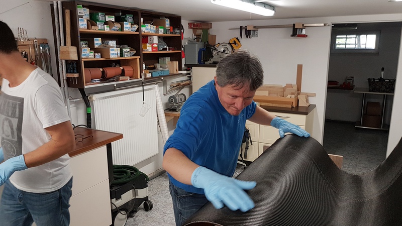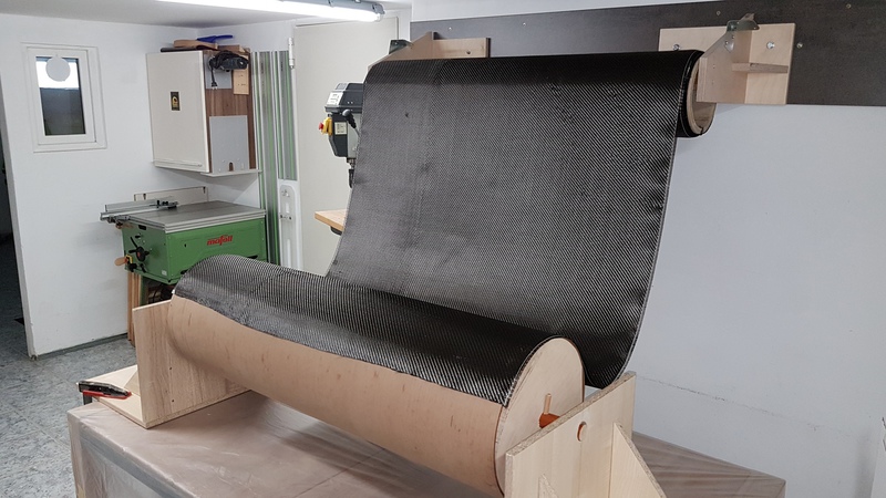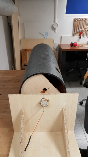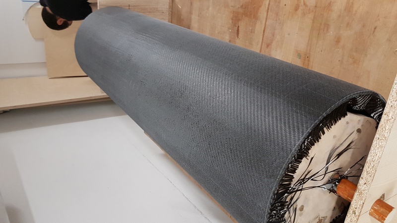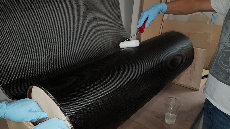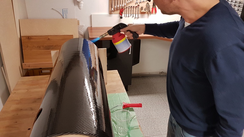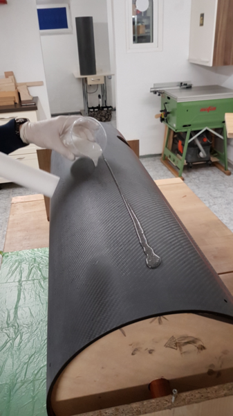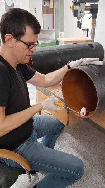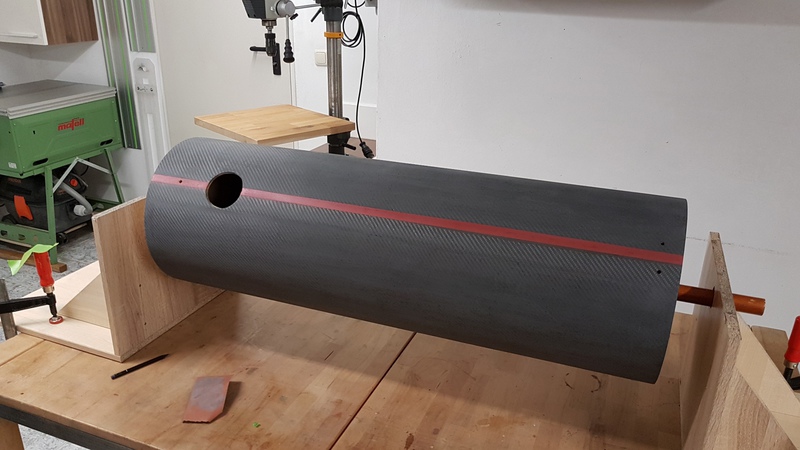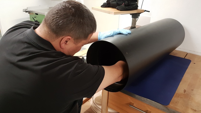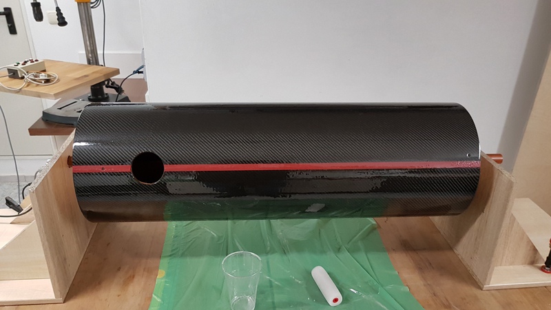 Um eine gleichmäßige Lage Epoxid-Harz getränkte Kohlefaser aufzubringen, wurde der Tubus seitlich mit Deckel versehen und drehbar in einem Holzgestell aufgehängt. Die oberhalb der Konstruktion aufgehängte Kohlefaserrolle wurde abgewickelt und mit dem Epoxidharz und Malerrollen aufgetragen.