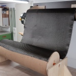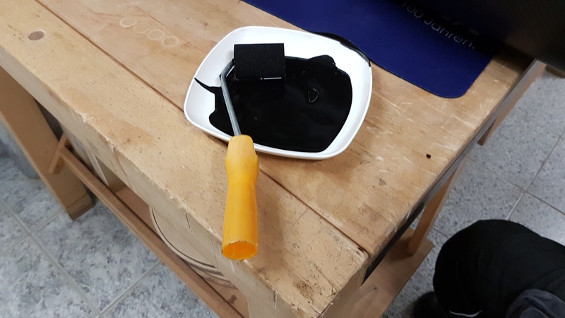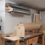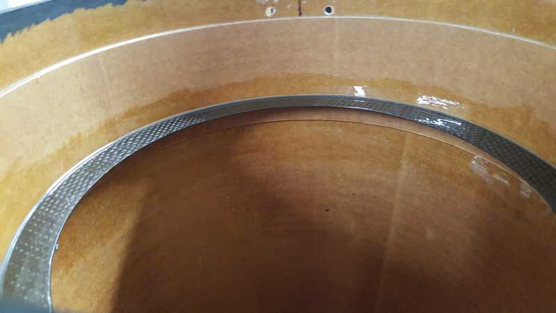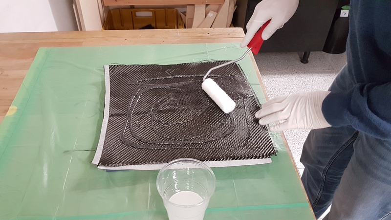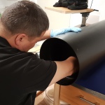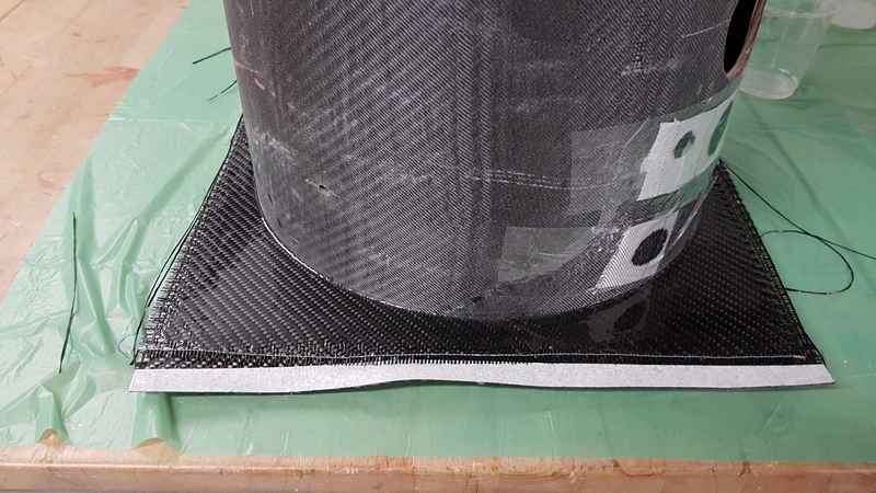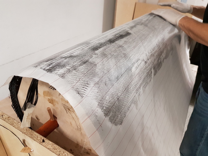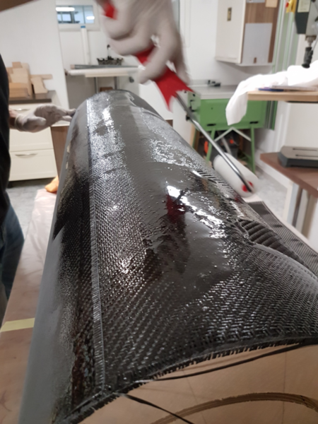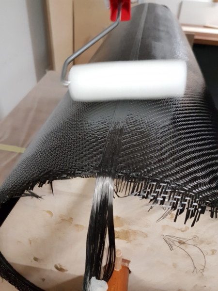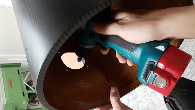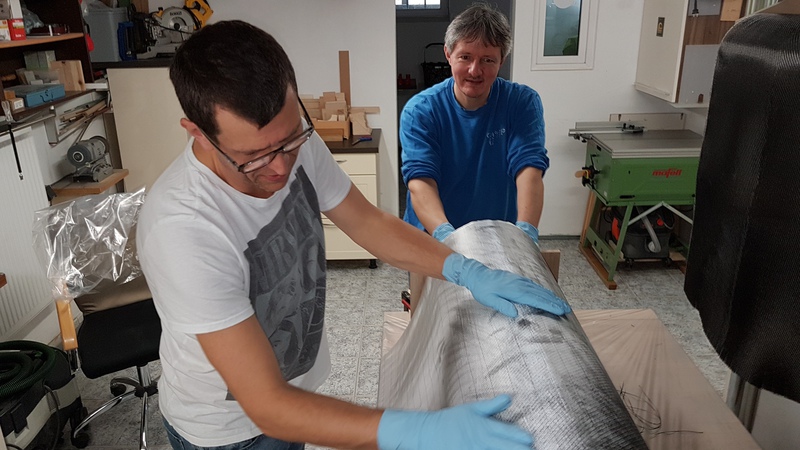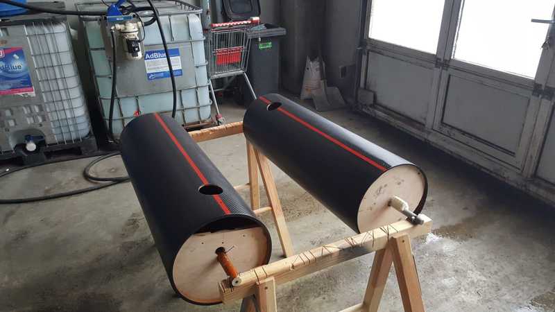 Um eine gleichmäßige Lage Epoxid-Harz getränkte Kohlefaser aufzubringen, wurde der Tubus seitlich mit Deckel versehen und drehbar in einem Holzgestell aufgehängt. Die oberhalb der Konstruktion aufgehängte Kohlefaserrolle wurde abgewickelt und mit dem Epoxidharz und Malerrollen aufgetragen.