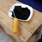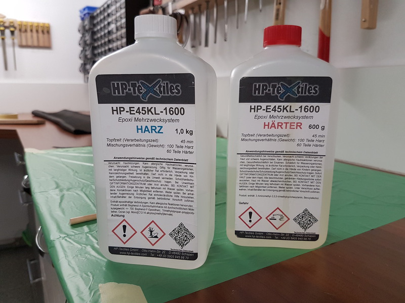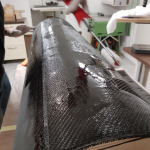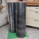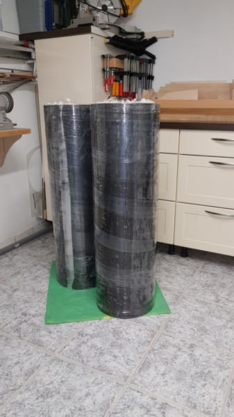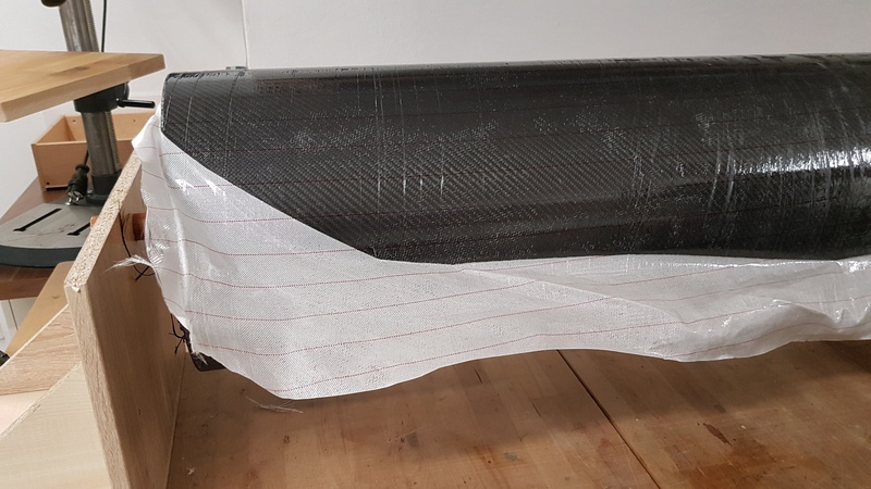 Nachdem das geschehen war, wurde der Tubus anschließend noch mit einer Lage Abrissgewebe versehen und mit Zellophan Folie umwickelt. Das so erhaltene Sandwich wurde dann nach dem Abbinden ausgespannt und stand nach dem 24 stündigen Durchtrocknen für eine weitere Kohlefaserschicht bereit.
