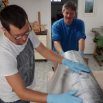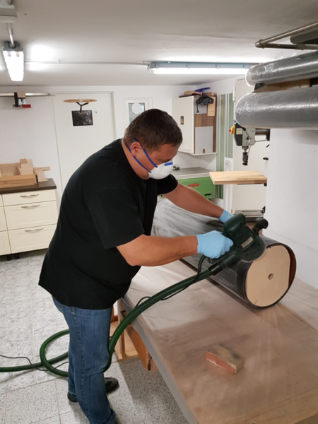 Ein paar Tage später konnten wir darangehen, die Tuben zu schleifen. Eine sehr schmutzige Arbeit, zu der wir uns dann mit einem Maximum an Arbeitsschutzartikeln ausstatteten. Grob- und Feinschliff dauerten eine ganze Weile, mussten aber sehr ordentlich ausgeführt werden, damit die Tuben am Ende auch gut ausschauten.