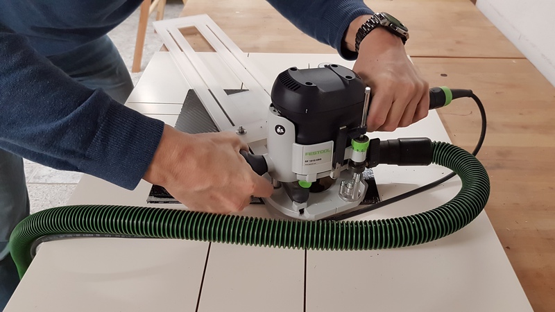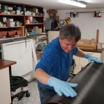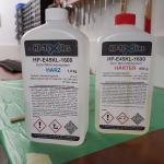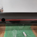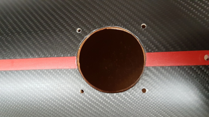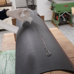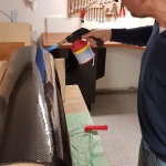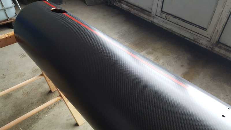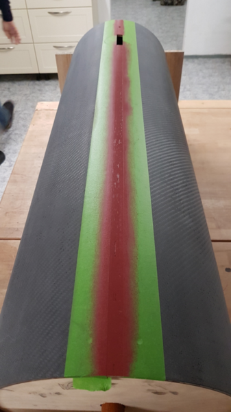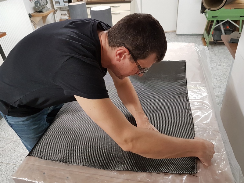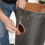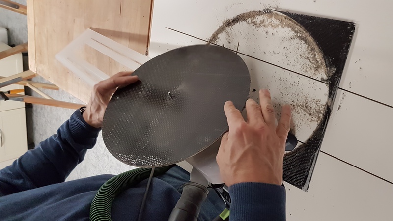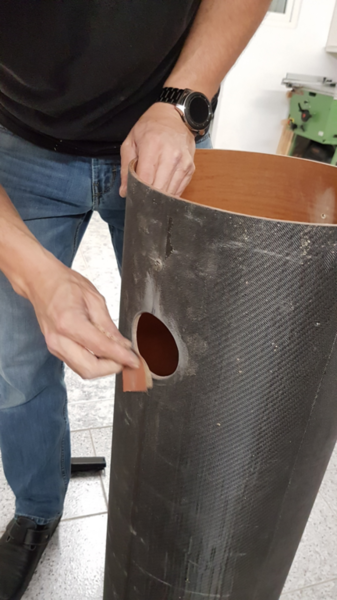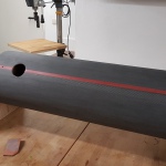 Auf der Vorderseite wurde jeweils eine Lage Kohlefaser auf laminiert, die dann mit der Oberfräse nach dem Aushärten nachträglich ausgeschnitten wurde. Zuvor galt es noch Unregelmäßigkeiten im Tubus zu kaschieren, damit die Tuben nach dem Schliff eine gleichmäßige Oberfläche bekamen.
