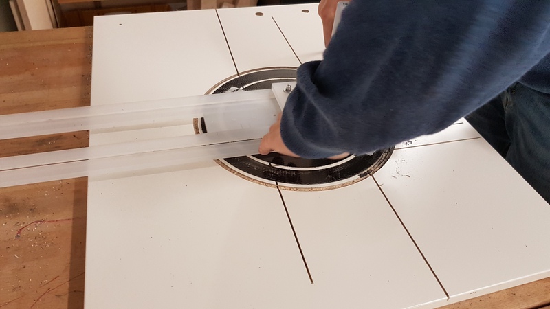 Am Anfang unserer Bauaktion stand das Kürzen der Tuben auf das richtige Maß, dazu wurde an Patricks Kreissäge ein Anschlag gesetzt und zu zweit gesägt. Das Hartpapier (Pertinax) lässt sich im Grunde verarbeiten wie Holz, riecht etwas nach dem Kunstharz, was darin verarbeitet ist.