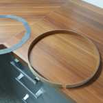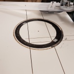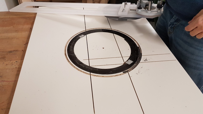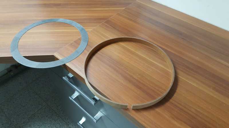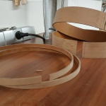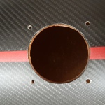 Vor dem Hauptspiegel sollte eine Blende den störenden Lichteinfall verhindern. Dazu fertigte Patrick aus dünnem Sperrholz und Kohlefaser Sandwiches an, die wir mit der Oberfräse kreisrund zu Ringen ausschnitten. Diese wurden dann ganz zum Schluss in den Tubus eingeklebt.