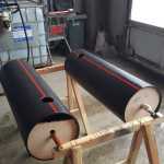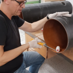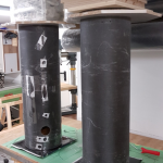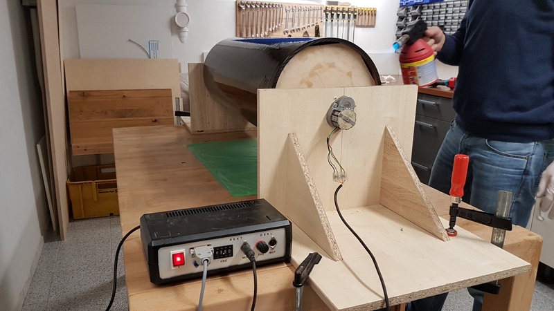 Das drehbar gelagerte Gestell wurde für die letzte Epoxid-Deckschicht mit einem kräftigen Synchronmotor ausgestattet, der die Tuben während des Abbindens in Rotation halten sollte.