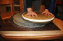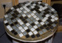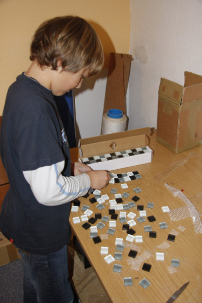 Durch den negativen Abdruck war nun eine gewölbte Form entstanden, die dem Rohlingradius entsprach. Diese wurde dann mit kleinen Glasmosaiksteinen beklebt, die wir zuvor im Baumarkt ausfindig gemacht hatten. Mit Epoxydharzkleber (bitte nur gute Qualität verwenden) gelang dieses sehr gut. Um das Herausbröseln des im Fliesenkleber vorhandenen Sandes zu verhindern, versiegelten wir das gesamte Tool ebenfalls mit Epoxy.