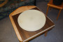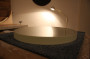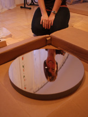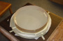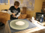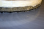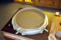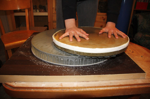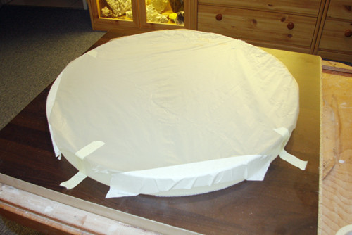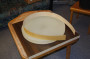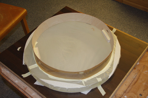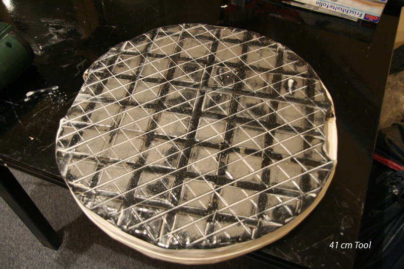 Nun ging es daran, ein geeignetes Tool zu gießen. Dazu wurde der Spiegel mit einer Plastikfolie abgedeckt und ein Ring in zukünftiger Toolgröße von 400 mm auf der Folie mit Klebeband fixiert. Mit Fliesenkleber wurde dann die Form auf eine Höhe von ca. 3 cm aufgefüllt und glatt gestrichen. Nach drei Tagen war das Tool trocken und ließ sich ohne Probleme vom Spiegel und der Folie lösen.
