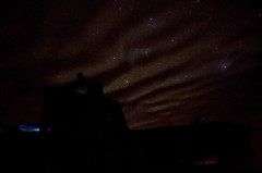 Dunkel ist es dann, wenn Wolken als pechschwarze Balken über den Himmel ziehen und man wirklich die Hand vor Augen nicht mehr sehen kann. Eine ganz neue Erfahrung für uns Lichtverseuchten Mitteleuropäer. Die Aufnahme entstand auf der Farm Hakos und zeigt auch, dass es in Namibia bewölkt sein kann und es keine 100%ige Garantie auf perfekten Sternenhimmel gibt.