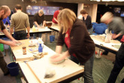 Die Herstellung der Pechhaut geschah von nun an immer im Team, da es für alle Teilnehmer interessant und spannend zugleich war, den Werdegang einer Pechhaut mit zu verfolgen. Dabei wurde auf den unten liegenden Spiegel ein Blatt Backpapier gelegt und darauf das heiße und flüssige Pech gegossen. Das ganze roch so, als ob man ein Stück Straße mit einer Teerschicht belegen würde. Nach einer kurzen Abkühlphase wurde dann die Schleifschale mit der konvexen Seite auf das Pech gelegt. Nach einer weiteren Kühlphase konnte die Schleifschale mit dem Pech angehoben und das Backpapier entfernt werden. Das überstehende Pech wurde mit einem Messer abgetrennt. Nach dem erneuten Erwärmen mit dem Heißluftfön wurde noch eine Gitterstruktur eingepresst, damit sich das Poliermittel gleichmäßiger verteilen konnte.