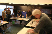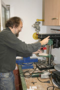 Stathis erklärte kurz die ersten Schritte des Grobschliffes und die Teilnehmer begannen mit ohrenbetäubendem Lärm ebenfalls ihre Spiegel in Angriff zu nehmen. Bereits im Treppenhaus war das unüberhörbar laute Geräusch des abrollenden 80ger Karbopulvers zu hören und sorgte bei dem ein oder anderen Vereinsmitglied für Irritationen. Die Atmosphäre unseres Planetariums glich zeitweilig dem eines Fitnessstudios. Der Schweiß rann in Strömen und die Spiegel begannen allmählich die erwünschte Vertiefung in der Mitte zu zeigen. Mit Aluschiene und Schieblehre bewaffnet wurde die Vertiefung in der Spiegelmitte nachgemessen.